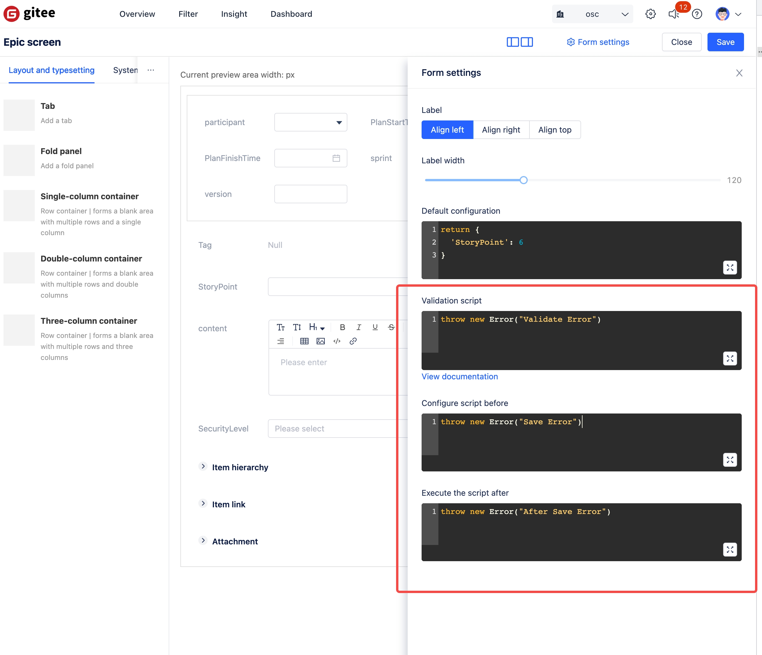 表单校验脚本分为,校验脚本,保存前校验脚本,保存后校验脚本,可以在界面配置的的表单设置中配置: