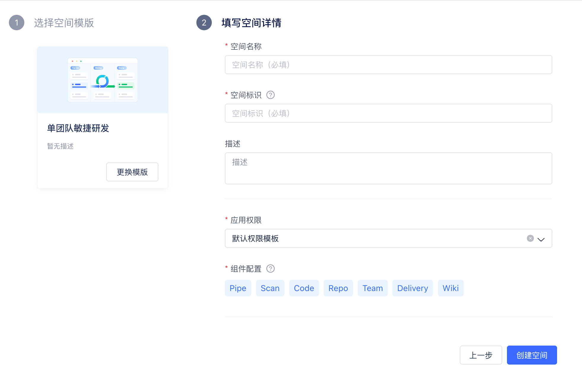 点击【新建空间】,可以选择继承模版空间或新建普通空间。选择继承模版后,新建的空间会继承模版空间的配置及面板配置。新建普通空间需要提前配置好权限方案、层级方案等内容。然后填写空间名称、空间标识等信息即可创建成功