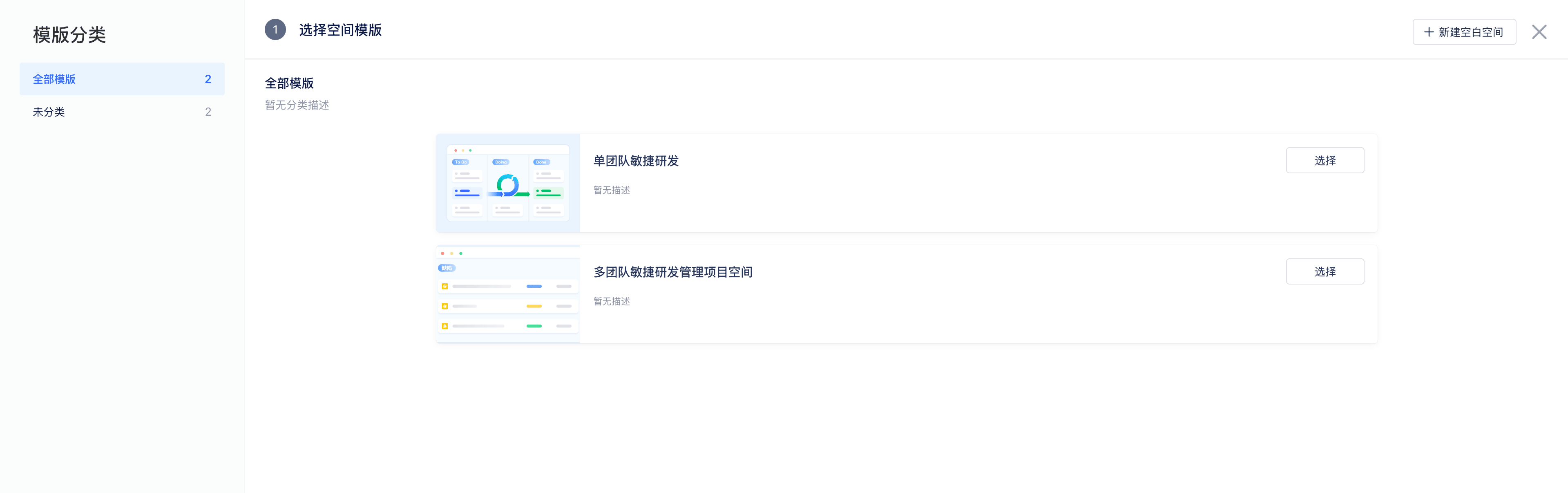 点击【新建空间】,可以选择继承模版空间或新建普通空间。选择继承模版后,新建的空间会继承模版空间的配置及面板配置。新建普通空间需要提前配置好权限方案、层级方案等内容。然后填写空间名称、空间标识等信息即可创建成功