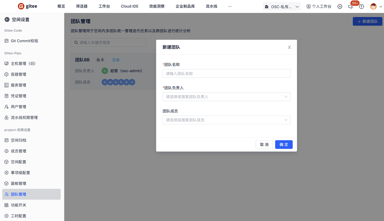 新建团队:点击新建团队,输入团队名称等信息可以创建一个新的团队。