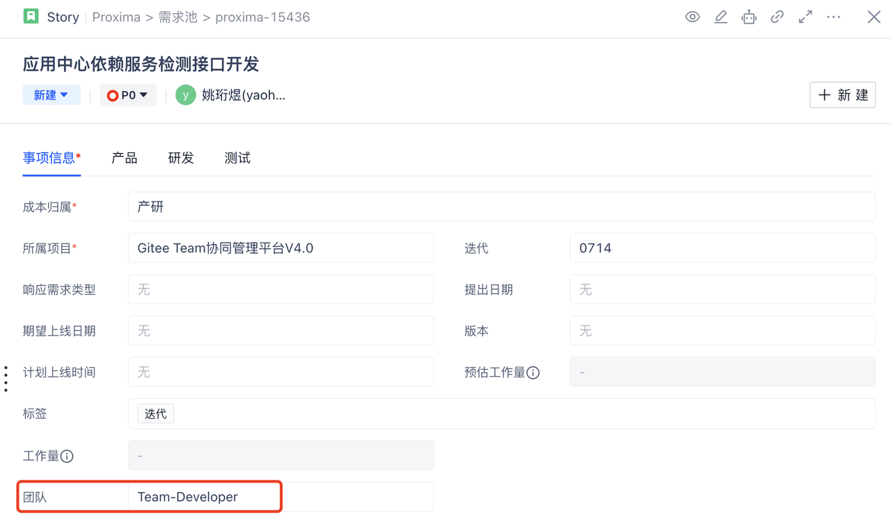 团队开启后在界面配置页将团队拖到对应的界面上,然后再新建事项或者编辑事项时选择将任务/需求分配给哪个团队