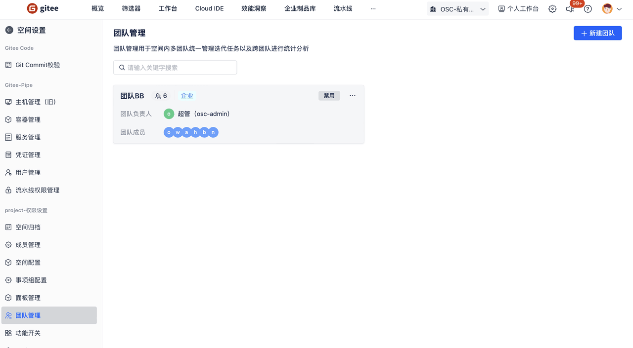 可创建空间内的团队,查看空间所有已创建的团队。可对事项分配负责的团队。