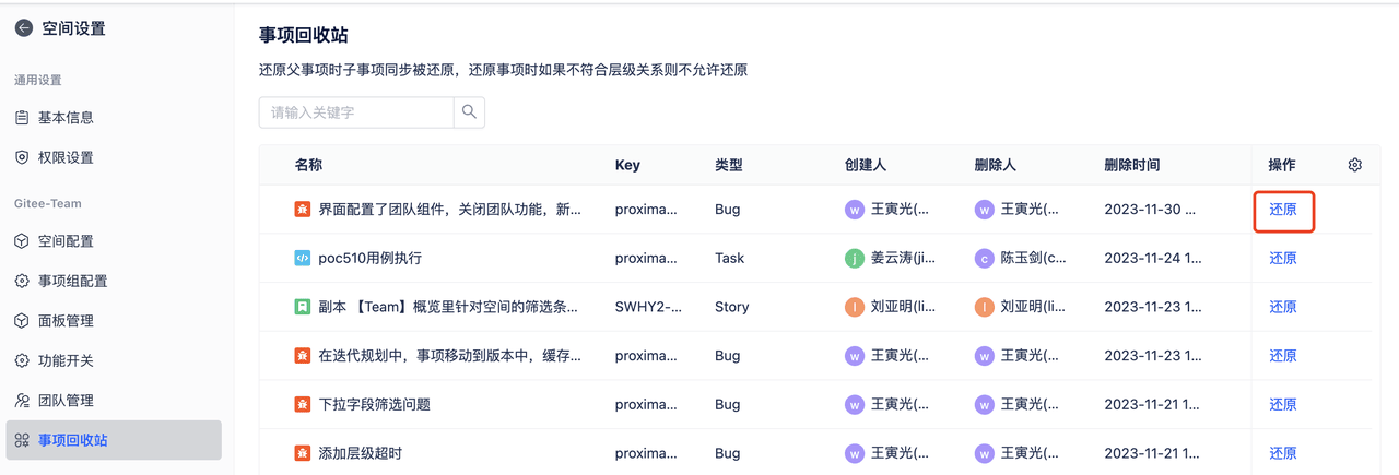 进入到事项回收站页面,点击需要【还原】的事项,还原规则: