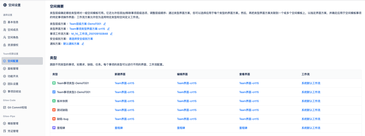 空间配置页面展示此空间内的所有配置信息,包含引用的空间模板、事项类型层级方案、事项类型界面方案、事项类型工作流方案、安全级别方案。