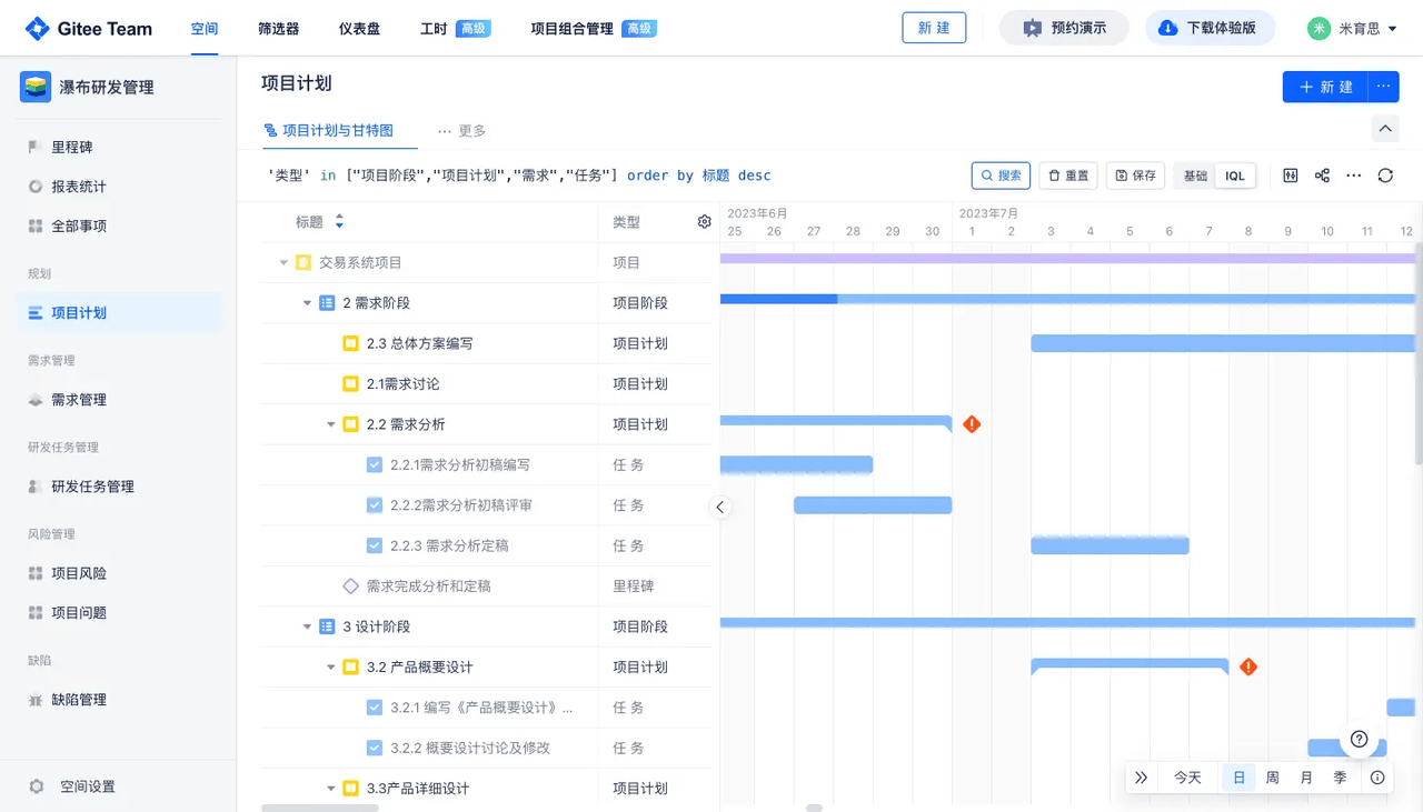 通过甘特图的形式帮助团队进行严格的范围管理。团队成员可以在平台上记录和评估任何需求变更。项目经理可以确保即便在范围调整后,项目依然能够按照既定的时间表和预算目标推进,同时维持项目的质量和目标一致性